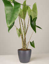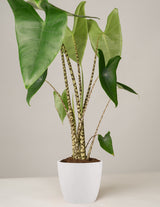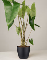 Alocasia Zebrina zählt zur Familie der Aronstabgewächse und stammt aus den tropischen Regenwäldern Südostasiens. Vor allem auf Borneo kommt das Tiger-Pfeilblatt häufig vor und kann dort gut vier Meter hoch werden. Es sind 79 Arten bekannt. Aufgrund ihrer markanten Blätterform ist sie auch als Elefantenohrpflanze bekannt geworden.