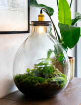 Groß, größer, am größten: Der Ecolight XL darf nicht fehlen und bietet Platz für größere Pflanzen. Der Lampensockel aus hochwertiger Eiche wird von einem lokalen Unternehmen handgefertigt und mit einer kupferfarbenen Fassung und einem hellbraunen Eisenkabel mit Schalter versehen.