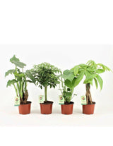 Arbeiten im Urban Jungle. Mit diesem frischen Dschungel Mix kommt Schwung an jeden Arbeitsplatz. Das Zimmerpflanzen Quartett besteht aus der der Alocasia Cucullata mit ihren schönen pfeilförmigen grünen Blättern. Sie zeichnet sich durch einen bemerkenswert kompakten Wuchs aus. Die Glückskastanie Pachira (auch bekannt als Geldbaum) ist eine schöne Palme mit einem geflochtenen Stamm. Die Schefflera wird wegen ihrer ungewöhnlichen Blätter auch Fingerbaum genannt. Sie ist eine sehr robuste Pflanze und benötigt kaum Aufmerksamkeit. Die großen, löchrigen Blättern der Monstera Deliciosa verleihen ihr ein besonders stylisches Aussehen und sind für ihren Spitznamen "Swiss Cheese Plant" verantwortlich.